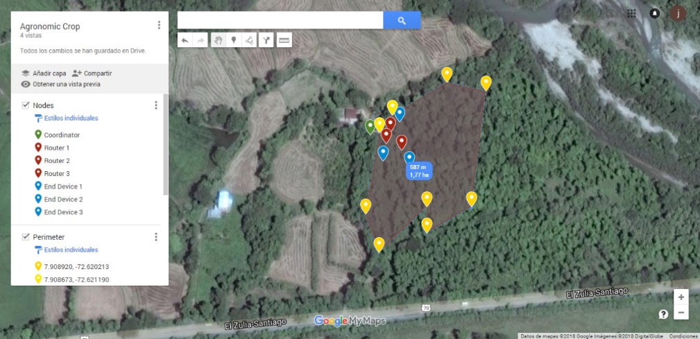 The coordinates of the crop, located in a rural area, are 7°54’29.52” North Latitude and -72°37’16.788” West Longitude. (Fig. 5) illustrates the geographical location of the crop, the selected measurement area, the location of the sensor nodes, and the surrounding geography. The total area of the crop is 2.7 hectares; the monitoring system covers about 3 % of the crop area; the image and locations were obtained with Google Maps Web tool.