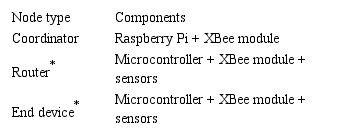 The Raspberry Pi and the XBee module work together as the Coordinator node of the network and use the Zigbee protocol to receive the information. Table 1 shows the components of each type of node, and (Fig. 2) illustrates the cluster tree topology.