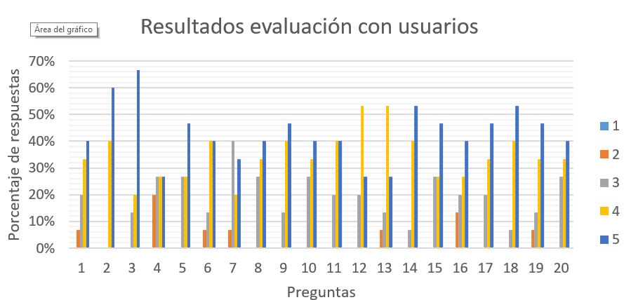 En la (Fig. 10), se presentan los resultados de la evaluación realizada, agrupados por pregunta, y se indica para cada opción el porcentaje de usuarios que la seleccionaron.