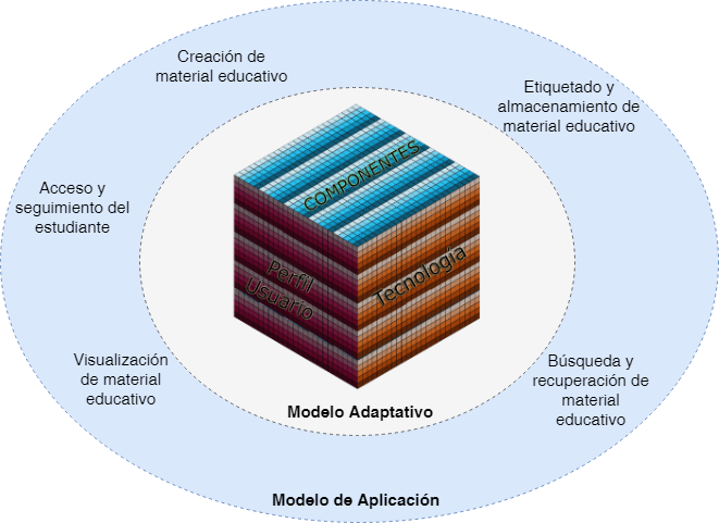 El Modelo Adaptativo es un modelo multidimensional por capas, que da gran versatilidad a la propuesta. Las dimensiones corresponden a las características asociadas al perfil del estudiante, los componentes a adaptar y las tecnologías que soportan la adaptación. Cada dimensión está compuesta por diferentes capas que corresponden a características específicas, las cuales se pueden analizar de forma independiente o superpuestas en un enfoque integrado, según las necesidades de adaptación.
