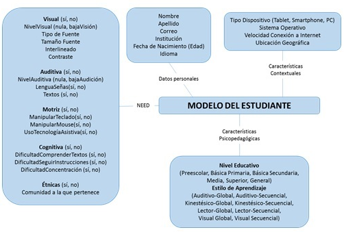 La categoría denominada como need corresponde a aquella en la que se tienen en cuenta las Necesidades Especiales de Educación en la Diversidad, con el fin de que el entorno educativo y los materiales entregados puedan ser adaptados, de acuerdo a las necesidades de inclusión concretas del usuario.