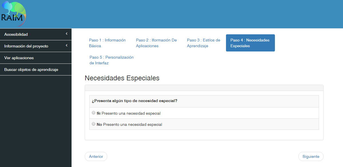 El objetivo es identificar si el usuario presenta alguna discapacidad (visual, auditiva, motriz o cognitiva) o necesidad étnica. Según lo indicado por el usuario, se determinan características adicionales para cada caso, asociadas principalmente con la forma en que este interactúa con el sistema, el tipo de contenido más adecuado y los requerimientos para su presentación.