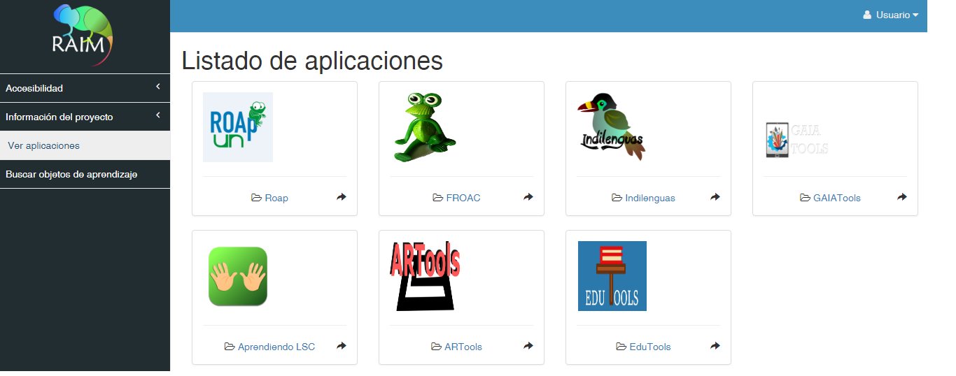 La plataforma raim recoge herramientas que atienden a los requerimientos expuestos en el modelo de aplicación del framework, para lo cual aprovecha tecnologías web y de realidad aumentada, así como herramientas específicas y de material etnoeducativo para la creación de recursos educadores para personas con discapacidad visual y auditiva. Igualmente, se integran herramientas que permiten el etiquetado, almacenamiento, búsqueda y recuperación de estos recursos. En la (Fig. 7), se presenta la interfaz desde la cual se accede a las plataformas integradas.