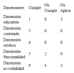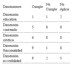 Para la plataforma en evaluación, 15 de los ítems de la lista de chequeo no aplican, es decir, son aspectos que no se deben evaluar, porque no se requieren para esta herramienta específicamente. De los elementos evaluados, seis no cumplieron con lo requerido, por lo que fue necesario que los desarrolladores hicieran las correcciones pertinentes.