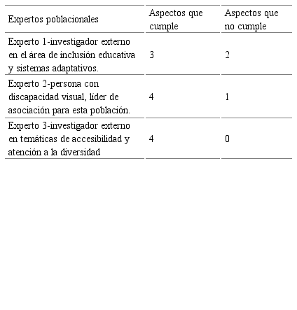 En la (Tabla 3), se resumen los resultados de esta etapa. En términos generales, los expertos hicieron recomendaciones en cuanto a la navegación por teclado en algunas secciones de la plataforma, la forma como se visualizaban los resultados de las búsquedas del material educativo y la inclusión de un mecanismo que facilite determinar si las adaptaciones son adecuadas o no.