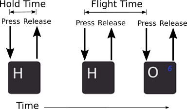 A total of six-time series are created when the user types each character: three when the key is pressed and three when the key is released. These times are shown in Table 3. With this information, it is possible to extract 2 main features: Hold time, which is the time between press and release of a key; and Flight time, which is the time between pressing a key and pressing the next one, as described in (Fig 5). The thirteen features that are extracted per segment are described below: