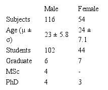A total of 170 subjects (116 male) participated in this study. The average age was 24 years old. The subjects were asked to perform 5 different tasks which were