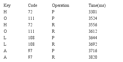 Computers can provide the ASCII code of the characters that are typed when a text is written. They can also store the time the keys were pressed (P) and released (R). (Table 3) shows an example with the raw information that can be extracted when the word “Hola” is typed.