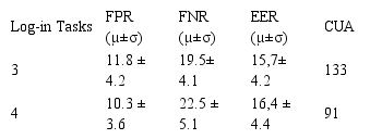 The results of this experiment are shown in Table 4. The performance is measured in terms of FPR and FNR. The usability of the method is measured in terms of the Cost to a User to Enroll (CUE) and the Cost to a User to Authenticate (CUA) [17]. These costs refer to the number of keys required to be pressed to do the registration or authentication procedure. The registration model is generated with the first 4 tasks; therefore, the CUE is 314 keystrokes.