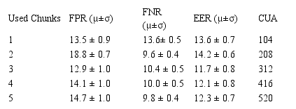 Table 5 shows the performance and usability of the system by varying the number of chunks used to decide whether the user is valid or not. In this case the CUE is the same as the previous experiment, because the same tasks are used to create the registration model.