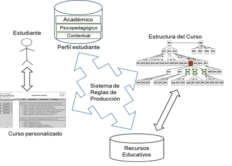 En la (Fig. 1) se muestra, en términos generales, el sistema propuesto y se definen los diferentes componentes que reflejan el enfoque planteado. Como se aprecia, el curso, el módulo o la temática educativa, se expresan mediante la jerarquía y composición de objetivos educativos o competencias a generar y están separados de los recursos educativos que soportan las actividades. Por otro lado, se encuentra el perfil o modelo del estudiante, que incluye diferentes características permanentes o no permanentes del aprendiz. Finalmente, el mecanismo que soporta la estrategia de adaptación es un sistema de reglas de producción que selecciona los recursos educativos a partir de las características del estudiante.