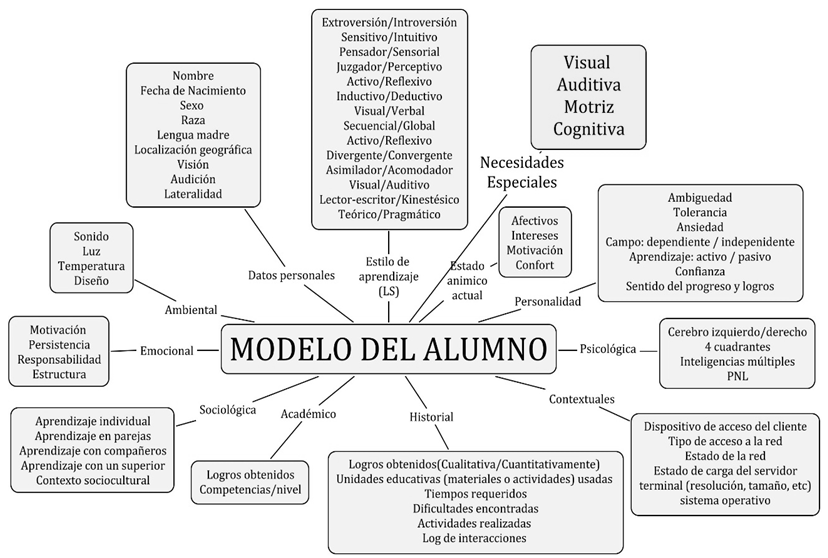 Un elemento principal de los sistemas adaptativos es el modelo del estudiante, compuesto de los conocimientos, metas, intereses y otras características permanentes y no permanentes que permiten al sistema distinguir entre diferentes usuarios [14]. Una revisión del estado del arte arroja diversas visiones en estos aspectos, entre los cuales, el factor común es un modelo de alumno basado en su nivel de aprendizaje, lo que guía el proceso de selección del contenido a presentar. Algunos trabajos utilizan ciertas características psicológicas y psicopedagógicas que son capturadas por medio de un formulario diligenciado [15].