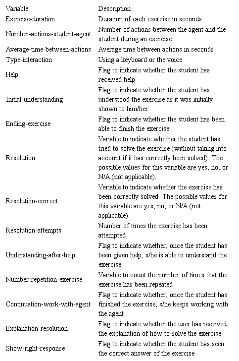 The data was processed to identify the most significant characteristics in this case. Thus, we found the most relevant ones: exercise duration, number of actions between the user and the agent, average time between actions, type of interaction (spoken or written), help used, exercise understanding, completed exercises, attempted exercises, solved exercises, number of attempts to solve an exercise, if once users have been given help they are able to solve an exercise, if once an exercise is completed students keep working with the agent, if the students receive some explanation at the end of an exercise, and if students see the correct answers to exercises. All the times were measured in seconds.