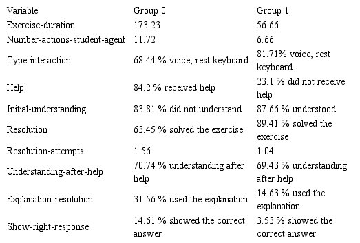 For the following variables, no results were obtained: duration of the exercise (exercise-duration), number of agent actions with the user during interaction with an exercise (number-actions-student-agent), average time between actions (time-average-between-actions), number of times that the exercise is performed (number-repetition-exercise), and attempts to solve the exercise (resolution-attempts).