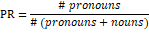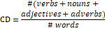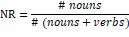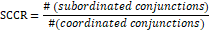 In turn, CD quantifies the amount of useful information in a transcript. The constants in (4) and (5) are defined as standard for the English language. The feature set is completed with Part-Of-Speech (POS) counts: Noun to Verb Ratio (NVR), Noun Ratio (NR), Pronoun Ratio (PR) and Subordinated to Coordinated Conjunctions Ratio (SCCR) (8), (9), (10) and (11) [25].