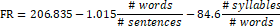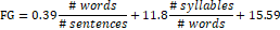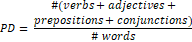 Eight grammar features were used with their corresponding equations: Readability of the transcript calculated with the Flesch reading score (FR) (4), Flesch-Kincaid grade level (FG) (5), propositional density (PD) (6), and content density (CD) of the transcript (7). The FR score indicates the educational attainment a person needs to easily read a portion of text, ranging from 1 to 100. A score between 70 to 100 means the text is easily readable by a person without specialized education. A score below 30 indicates that a text requires effort and a higher education to be read [21]. The FG measures writing skills, and ranges from 0 to 18. A score of 18 means a very complex and well-structured text. FG scores below 6 indicate a barely elaborated text [21]. PD measures the overall quality of propositions in a text.