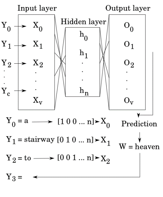 The vocabulary size is 𝜈. The 𝑌 words of the context {𝑌0, 𝑌1, …, 𝑌c} are the one-hot encoded inputs of the {𝑋0, 𝑋1, …, 𝑋𝜈} neurons at the input layer. The hidden layer has ℎ𝑛 neurons, where is the dimension of the W2V model. The output layer has 𝑂 𝜈 neurons. The values {𝑂0, 𝑂1, …, 𝑂𝜈} are used to predict the most probable word for the input context word 𝑊. This process is shown in (Fig. 2). Said model was trained with the latest Wikipedia data dump (February 2019).