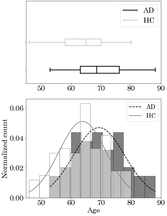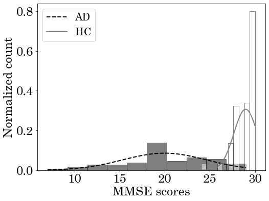 (Table 1) shows the demographic and clinical information of AD patients and HC. (Fig. 4) is a histogram of their Mini-Mental-State-Examination (MMSE) scores with the corresponding probability density distribution of both groups. (Fig. 5) presents the box-plot, histogram, and the probability density distribution of the age of both groups.