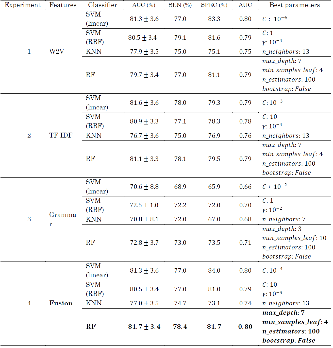 Statistical differences between the classifiers were found in all the experiments. This suggests that the experiments that use an ensemble or stacking techniques could produce better results. Experiments with deep learning techniques, a bigger dataset to retrieve TF-IDF features, a larger word vector dimension, and a considerably larger set of grammar features are needed in future work. Additionally, word embeddings of novel language models based on more sophisticated neural network architectures, such as BERT and XLNET, could lead to better results because such models have achieved state-of-the-art performance in numerous NLP tasks [27], [28], [29]. Further research is required with the aim of finding possible clinical interpretations to the results based on these kinds of models.