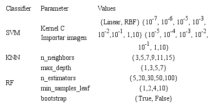Four experiments were conducted. The results of the three classifiers are reported for each experiment. The accuracy (ACC), sensitivity (SEN), specificity (SPEC), and the area under the Receiver Operating Characteristic curve (AUC) of the three classifiers are listed in Tabla 3.