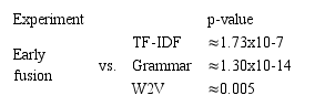 A statistical comparison between the best results obtained with the early fusion strategy and those obtained with each feature set reveals significant differences. Table 4 shows the p-values obtained in the experiments.