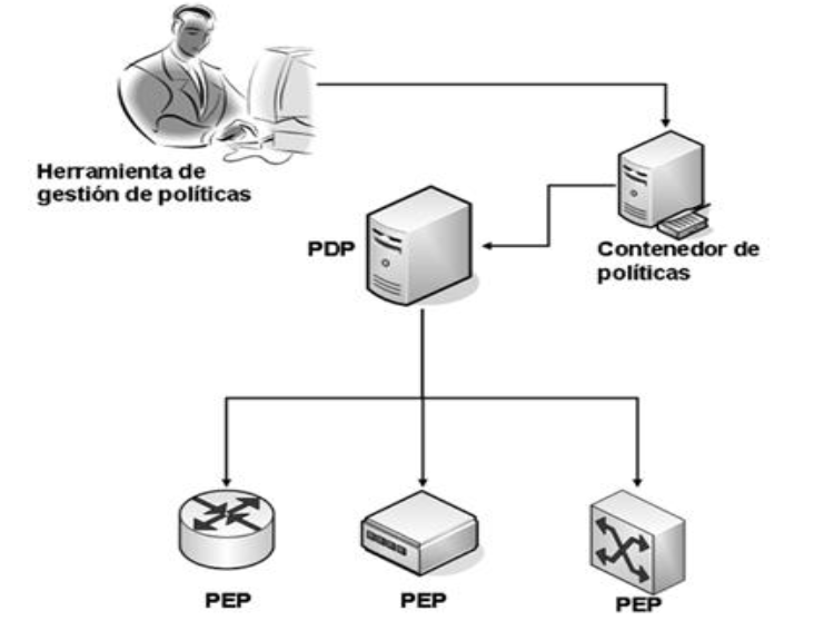 Según el grupo de trabajo del IETF (por las siglas en inglés Internet Engineering Task Force), un modelo de gestión basado en políticas incluye un contenedor o repositorio de políticas, un punto de decisión de políticas o servidor de políticas (pdp, por las siglas en inglés de Policy Decision Point) y uno o varios puntos de ejecución de políticas (pep, por las siglas en inglés Policy Enforcement Point). En los pep se aplican o ejecutan las políticas que gobiernan los dispositivos físicos. El pdp revisa las políticas almacenadas en el contenedor de políticas y efectúa un proceso de toma de decisiones independientemente de las características de los dispositivos asociados a los PEP.