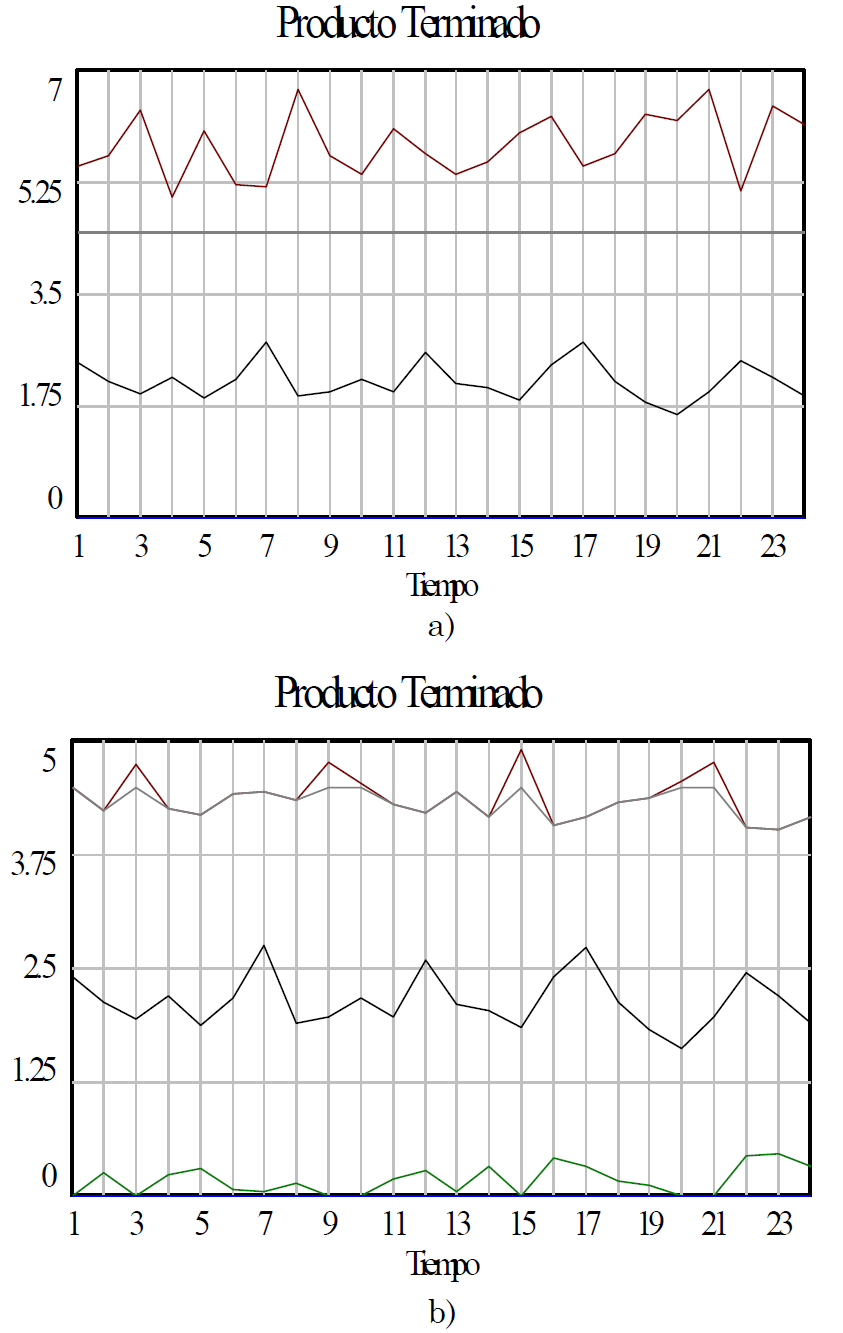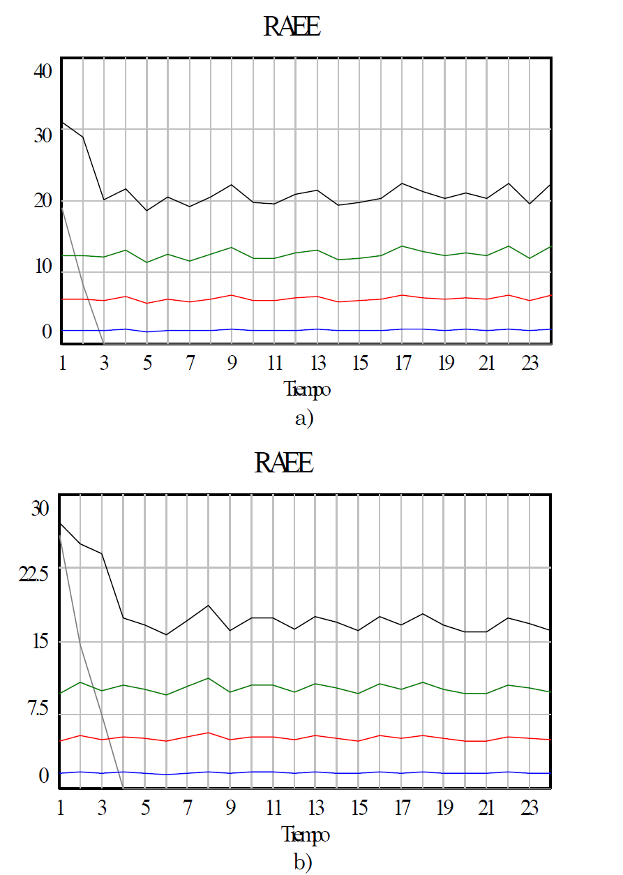 Como se observa en la Fig. 8, las dos simulaciones que se hicieron al modelo para la recolección de RAEE bajo el esquema de fabricación por orden de producción están sujetas al comportamiento de la demanda de pellet y productos recuperados. La primera simulación a) y la segunda simulación b) presentan el comportamiento de la demanda para la recolección informal.