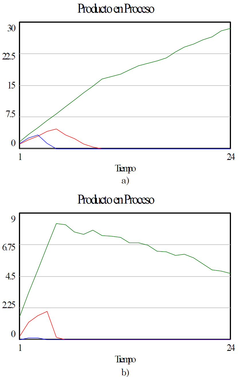 Bajo este esquema, el comportamiento de los resultados sugiere que el modelo representa adecuadamente la estructura propuesta, ya que se esperaría un aumento en el producto en proceso, aguas arriba de los procesos cuello de botella.