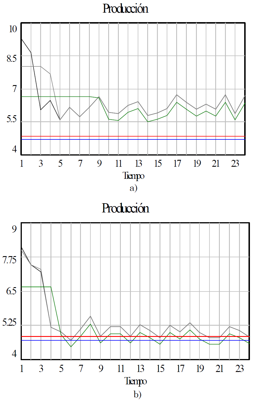 Otro aspecto para analizar es el comportamiento de los niveles de producción (Fig. 11). Esto permite identificar dos procesos que operan a capacidad máxima (secado y remolido, líneas azul y rojo respectivamente) en a) y b).gualmente, la producción de los otros procesos se determina a partir de las necesidades provocadas por los niveles de servicio, por lo que siguen el mismo comportamiento.