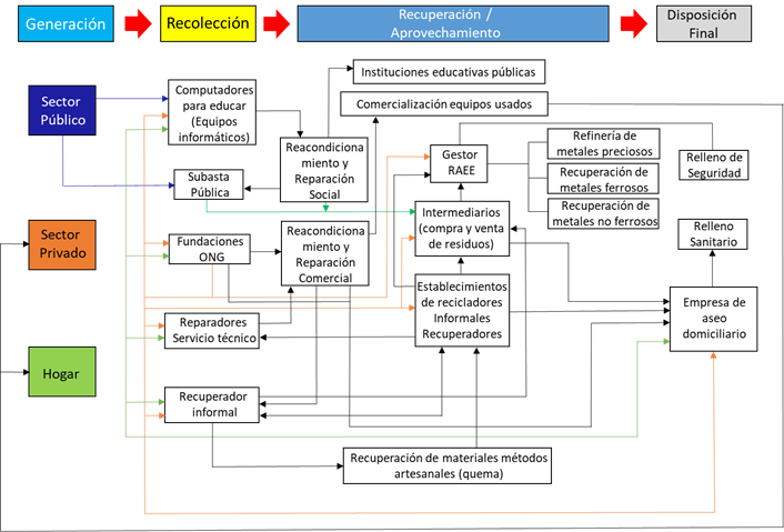 En Cali, se puede identificar una serie de cadenas de reciclaje por las cuales pasan los residuos. Como se evidencia en la Fig. 1, cada uno de los tipos de generadores de RAEE inicia su cadena de reciclaje de una manera diferente. Generalmente, en el sector público la salida de estos RAEE se lleva a cabo a través de subastas en las que diferentes compradores se quedan con ellos; en el sector privado, muchos de los RAEE generados en estas empresas son entregados a los gestores para que les den un manejo adecuado (servicio por el cual se paga un valor), aunque otros se entregan directamente a recicladores informales.