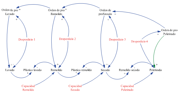 La última sección del sistema corresponde a la conexión entre el sistema de producción y los elementos de demanda, inventario de pellet, producción de pellet recuperado (en el diagrama “Pelletizado”).