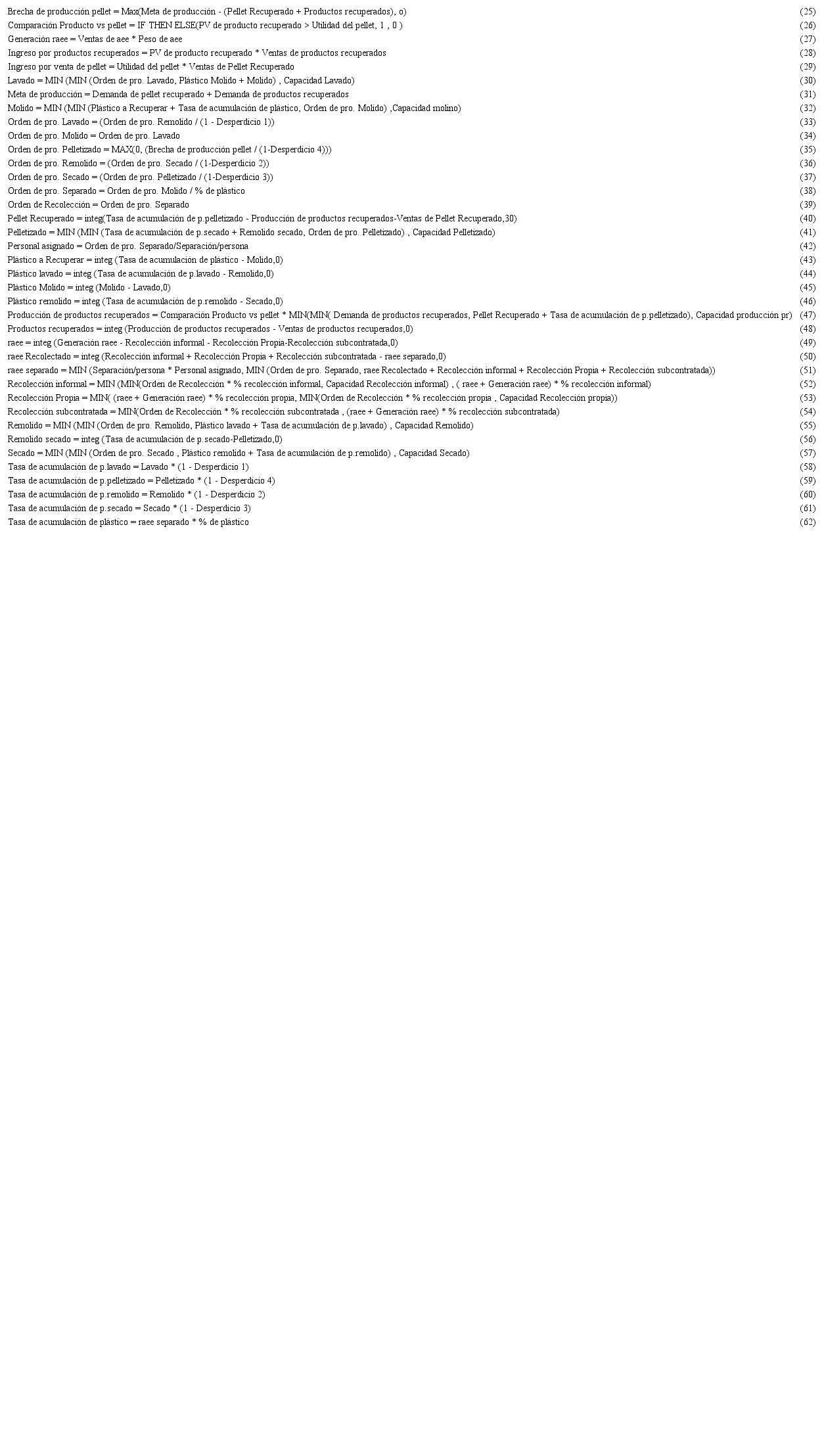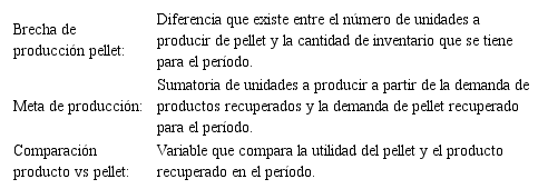 Lo anterior está sujeto a los parámetros exógenos al modelo de capacidades, demandas, niveles de desperdicio, asignación de canales de recolección y preferencia de ventas (entre venta de pellet o productos recuperados).