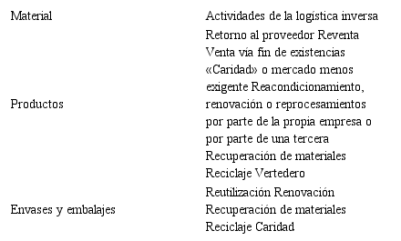 En la Tabla 2 se presenta un resumen de las actividades de la logística inversa, teniendo en cuenta el producto, el envase y embalaje.