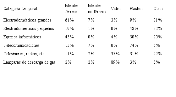 Los componentes principales de los RAEE varían significativamente según el tipo de aparato. En la Tabla 3 se detallan los porcentajes de cada componente para algunas de las categorías de RAEE y se identifica que, en electrodomésticos pequeños, equipos informáticos, aparatos para telecomunicaciones, televisores y radios, el mayor elemento presente en ellos es el plástico.