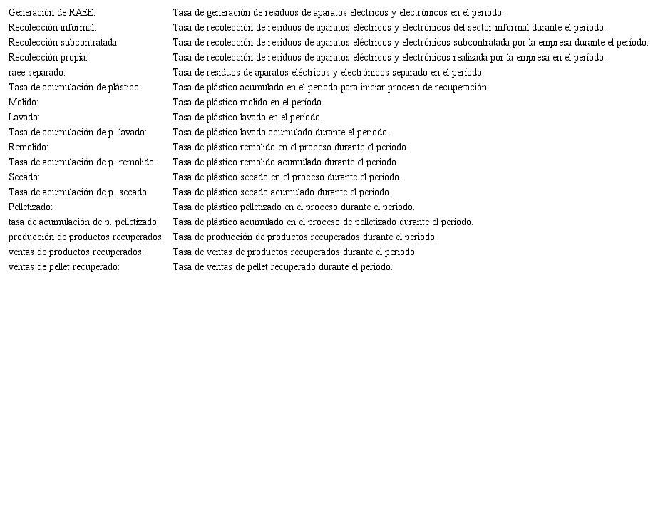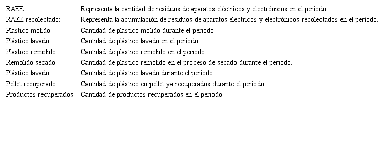 Una característica del modelo es que tiene en cuenta desde las relaciones, desperdicios y el porcentaje de plásticos presentes en los raee estudiados desde la venta, hasta todos los procesos productivos, para determinar las toneladas de raee necesarias. De igual forma, se observan de manera discriminada los distintos canales de recolección seleccionados.
