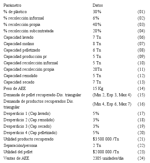 Dadas estas condiciones, para el estudio se seleccionaron los RAEE generados por el mercado de informática y las telecomunicaciones (esto incluye: computadores personales de escritorio, proyecciones de generación incluyendo CPU, ratón, pantalla y teclado, (Tabla 4); asimismo, se estimó la generación de este tipo de RAEE para la ciudad de Cali. Para determinar la generación de RAEE, todos los datos de entrada para la simulación se consignan en la sección de parámetros, discutida anteriormente. Las distribuciones de demanda se determinaron a partir de distribuciones triangulares dadas por los expertos, debido a la inexistencia de datos históricos para hacer ajustes de distribución.