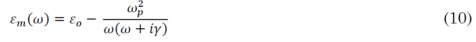 La constante dieléctrica de las nanopartículas de metal εm(ω) en este caso plata está dada por el modelo de Drude (10).
