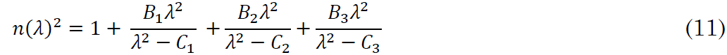 Donde B1=0.6961663, B2= 0.4079426, B3=0.8974794, C1=0.00467914826µm2, C2 =0.0135120631µm2, C3= 97.9340025 µm2 son los coeficientes de Sellmeier determinados experimentalmente.