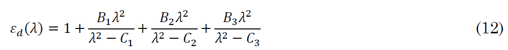 Finalmente, la constante dieléctrica de sílice εd se obtiene por medio de la ecuación de Sellmeier [29] que relaciona el índice de refracción del material n con la longitud de onda λ está dada por (11). Teniendo en cuenta que n2 =ε, (12).