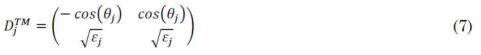 De forma similar, para obtener la matriz para la j-ésima capa con polarización TM en (1), la matriz de propagación se mantiene intacta y el cambio se hace únicamente en la matriz dinámica que se encuentra dada en (7).