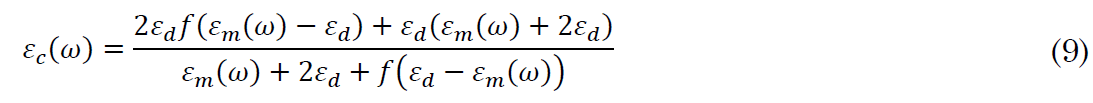 Donde εd es la constante dieléctrica de la sílice, εm(ω) es la constante dieléctrica del metal en este caso plata, f es el factor de relleno de las nanopartículas y ω la frecuencia angular.