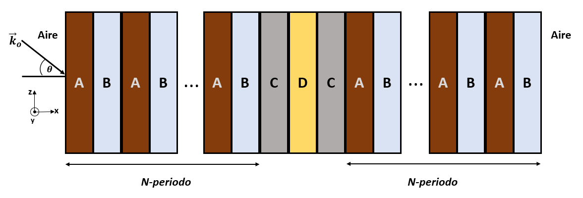 En la Fig.1 se muestra la estructura del cristal fotónico unidimensional compuesto por la alternación de los materiales SiO2 (capa A) y aire (capa B) de espesores d1 y d2, respectivamente, con periodicidad N en el eje x. La simetría de translación se rompe al introducir la nano cavidad en el cual las muestras de las células son infiltradas (capa D) revestido por el nano compuesto de Ag/SiO2 (capa C) que se forma al mezclar las nanopartículas de plata con la sílice. El espesor para estos últimos materiales es denotado por d3 y d4, respectivamente.