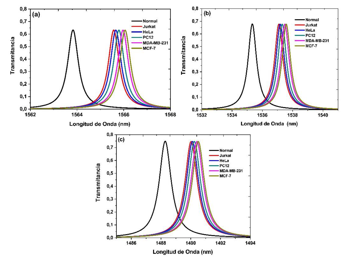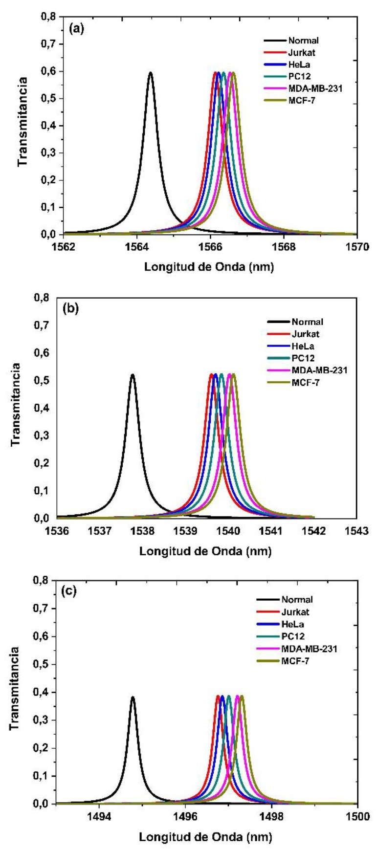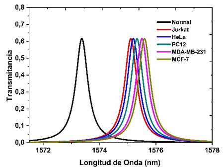 La Fig. 2, muestra el espectro de transmitancia con incidencia normal de la radiación, al infiltrar distintos tipos de células en la nano cavidad. Se logró observar corrimientos de los picos de resonancia de las células cancerígenas hacia longitudes de onda más largas respecto a la célula normal. Este corrimiento se produce debido al incremento de la constante dieléctrica.