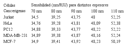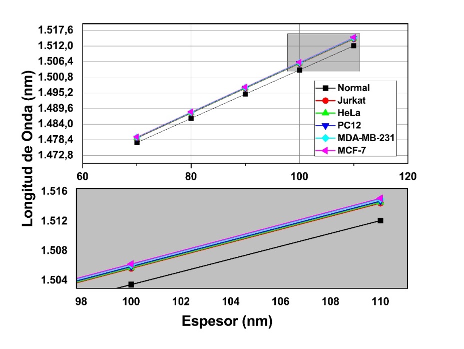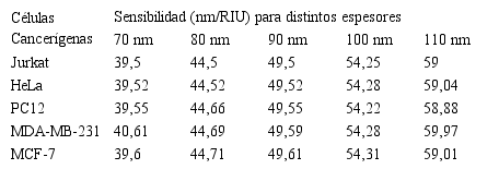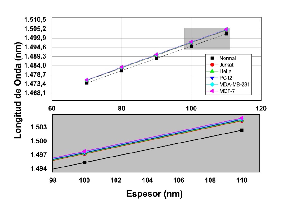 Finalmente, para una mayor optimización de la sensibilidad se variaron parámetros como: el espesor de la nano cavidad y factor de relleno de las nanopartículas de plata. Al aumentar el espesor de la nano cavidad encontramos corrimientos de los picos de resonancia a longitudes de más largas con un incremento en la sensibilidad, mientras que al aumentar el factor de relleno también se apreciaba corrimientos de los picos de resonancia a longitudes de onda más largas. Sin embargo, la sensibilidad decrecía. De esta forma, se logró obtener las condiciones necesarias para que la separación entre los picos de resonancia que caracterizan a cada célula cancerígena sea más distante respecto a la de una célula normal, de tal forma que permita una detección mucho más clara.