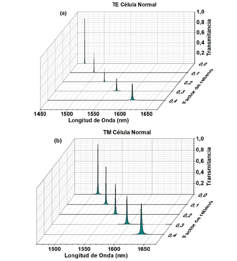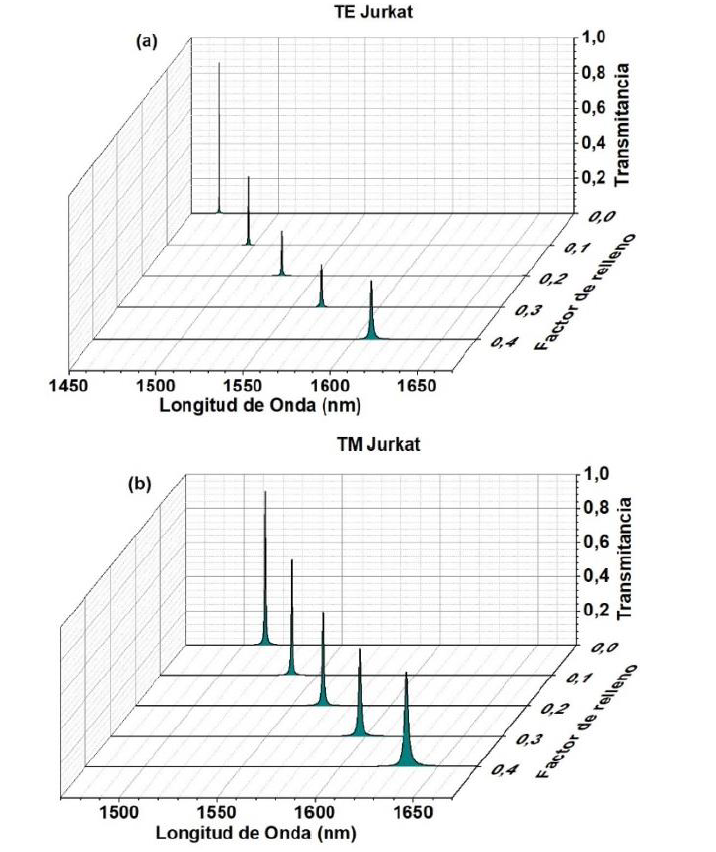 Finalmente, se varía el factor de relleno de las nanopartículas de plata, manteniendo constante el espesor de la nano cavidad d4=90nm, y los ángulos de incidencia para polarización TE 75° y para la polarización TM 50°. Como se puede observar tanto en la Fig. 7 (a) para polarización TE como en la Fig. 7 (b) polarización TM para una célula normal, al aumentar el factor de relleno de las nanopartículas de plata, los picos de resonancia dentro del espectro de transmisión se acortan y hay corrimientos a longitudes de onda más largas. En el caso de infiltrar una célula cancerígena Jurkat ocurre el mismo fenómeno, como se muestra en la Fig. 8. El mismo efecto ocurre si se realiza la simulación para las células HeLa, PC-12, MDA-MB-231 y MCF-7.