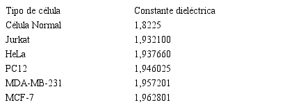 El mecanismo de detección se debe a la aparición de picos de resonancia dentro de la banda fotónica prohibida que caracteriza a cada tipo de célula infiltrada por medio de biopsia líquida [30]-[32] en la nano cavidad, cuyas constantes dieléctricas se muestran en la Tabla 1. La sensibilidad del biosensor se determina teniendo en cuenta los corrimientos de los picos de resonancias de las células cancerígenas con respecto a la de una célula normal ∆λ, esto debido a los cambios de índice de refracción ∆n y es calculada en términos de nm/RIU de la siguiente forma (13):