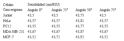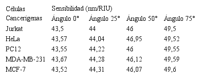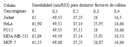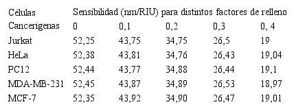 La Tabla 6 muestra los valores de la sensibilidad para la polarización TE con ángulo de incidencia de 75° para la célula normal y las células cancerígenas. Se pudo notar que existe una reducción de la sensibilidad al incrementar el factor de relleno de las nanopartículas de plata.