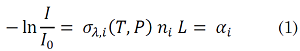 where I0 and I are, respectively, the intensity of the radiation before and after the interaction of the laser beam with the medium; σλ,i is the absorption cross-section of species i that depends on the temperature and pressure; ni, the concentration of species i; and L, the path length. ai is known as absorbance and, as (1) states, for a constant temperature, pressure, and path length, the absorbance should be proportional to the concentration of species i.The previous statement has one condition: it assumes that, for the catalytic cracking of one species (as is the case in this study), any interference of the products at the specific wavelength of the experiments is negligible. The results of Lopez-Zamora et al. [17] suggest that this is the case.