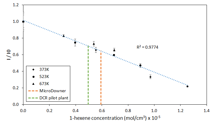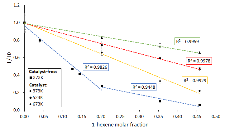 In turn, a linear trend was obtained when the variation of I/I0 with the molar fraction of 1-hexene was evaluated at the same temperature (373 K) but in the presence of an equilibrated catalyst. The error bars of catalyst-laden experiments are larger than those of the catalyst-free trials, as one would expect given the random noise that the particle flow causes.