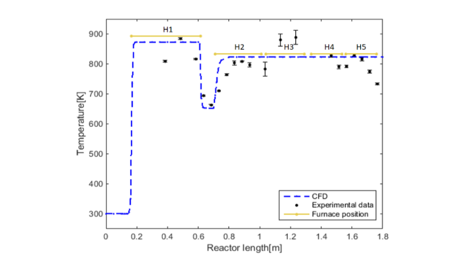 Most importantly, the measurements as well as the simulations indicate that a relatively flat profile can be obtained after the feed enters the reactor and the temperature significantly falls at around 0.6 m. There is some uncertainty in the measurements between 1.1 m and 1.3 m, when using a long thermocouple became difficult. While the results in Fig. 5 were obtained at a nominal temperature of 823 K, a similar profile is expected in the lower temperature range (373 K to 673 K) where the optical measurements were performed.